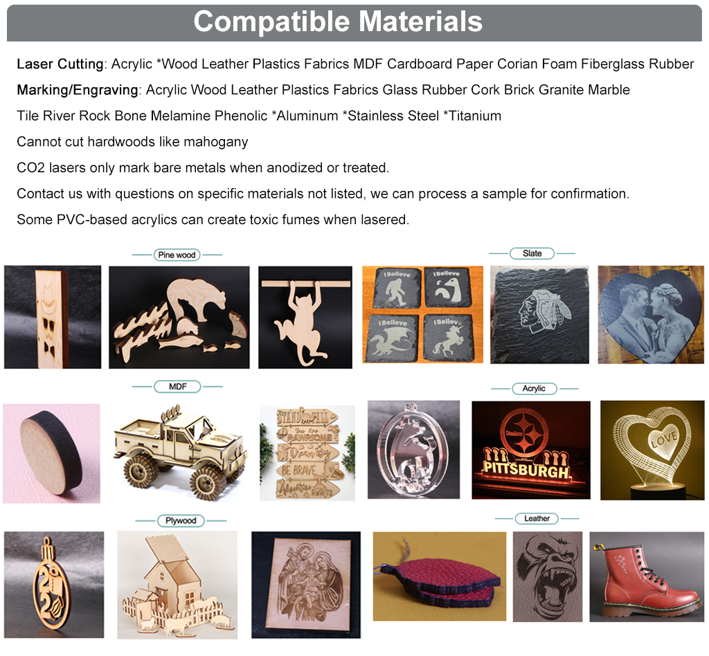 HL laser 1060G CO2 laser engraving machine is compatible with LightBURN and RDworks for Windows and Mac OS. The well designed style and suitable to: woodworking, textile cutting, industrial prototyping, industrial marking, sign making, aerospace